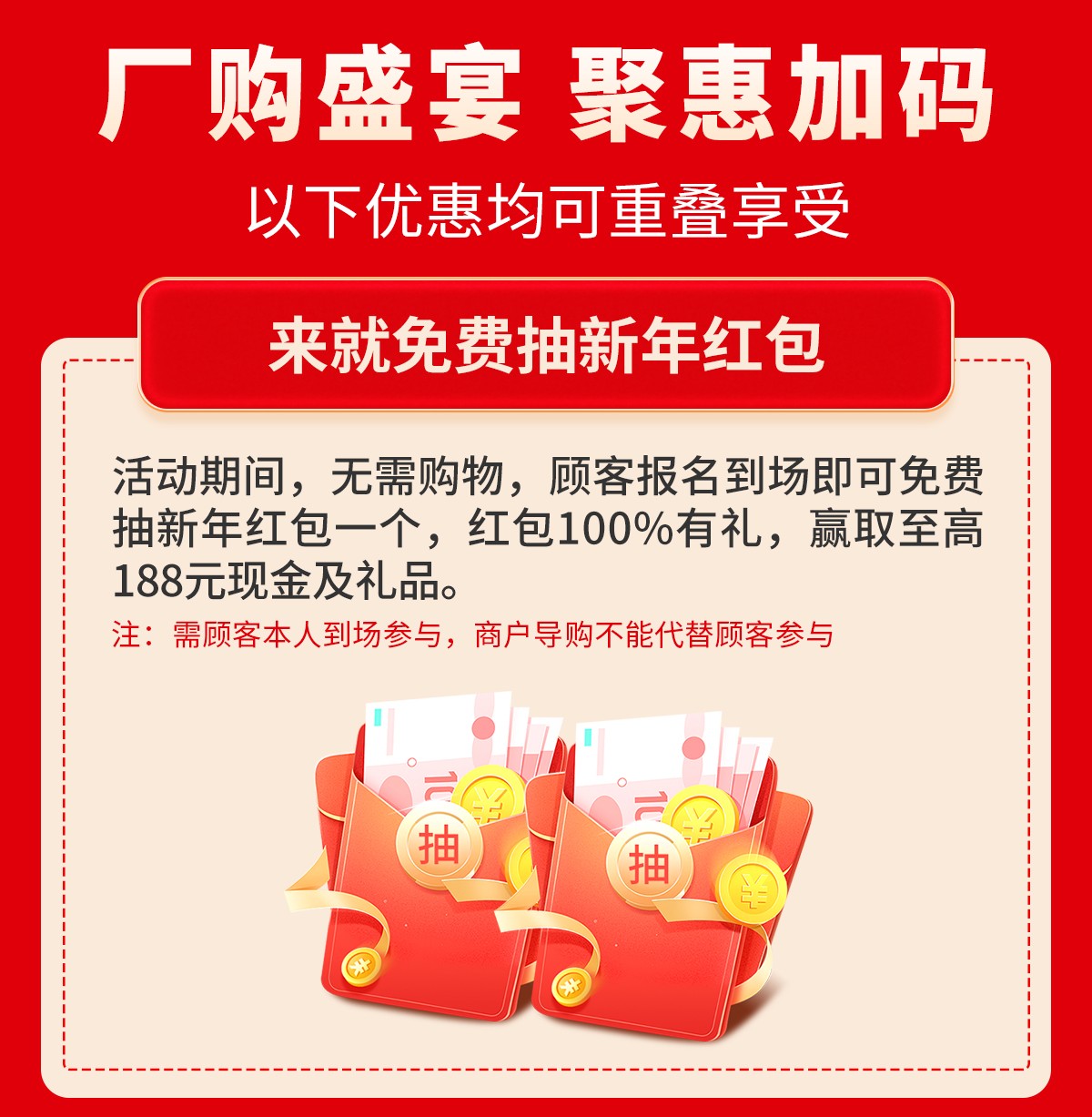 380余家具工厂厂购基地联合让利,来就抽新年红包,集章赢388元现金,下单豪送全屋家电+现金,狂抽苹果笔记本电脑大奖……优惠尽在1月1-3日『厂购盛宴 家具年博会』大型促销活动,赶紧报名亲临现场参加吧!