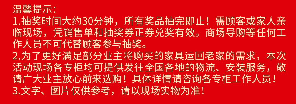 现场百万件特价产品同享活动价,请网上报名锁定优惠折扣,在1月1-3日(元旦三天)亲临现场查看。半年之内送货均有效,特殊情况还可以延迟。