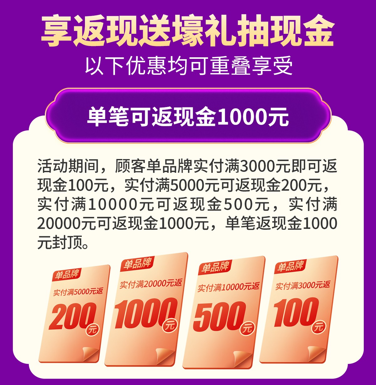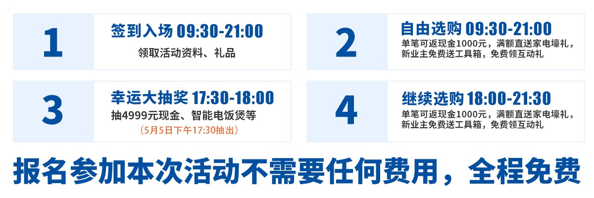 单笔可返现金1000元,满额狂送洗衣机/吸尘器/电烤箱等千件壕礼,新业主免费送工具箱,狂抽4999元现金大奖,4月25-26日/5月1-5日红树湾家具博览中心花都店联合好家网举办『家具家电狂欢 嗨购五一』大型促销活动,请赶紧报名亲临现场参与吧!